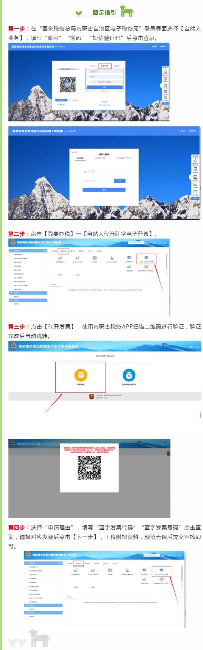 在“国家税务总局内蒙古自治区电子税务局”登录界面选择【自然人业务】,填写“账号”“密码”“短信验证码”后点击登录,登录后点击【我要办税】→【自然人代开红字电子普票】,进入界面后点击【代开发票】,使用内蒙古税务APP扫描二维码进行验证,验证完成后自动跳转,选择“申请理由”,填写“蓝字发票代码”“蓝字发票号码”点击查询,选择对应发票后点击【下一步】,上传附报资料,预览无误后提交审核即可。