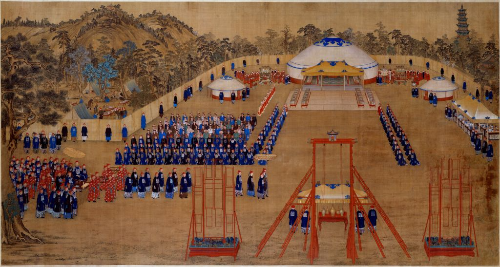 乾隆十九年(1754年)五月,乾隆皇帝在避暑山庄万树园连续多日设宴,热情招待赴热河入觐的杜尔伯特部首领等人。宫廷画家郎世宁等人奉旨所作的《万树园赐宴图》,生动再现了宴会盛况。