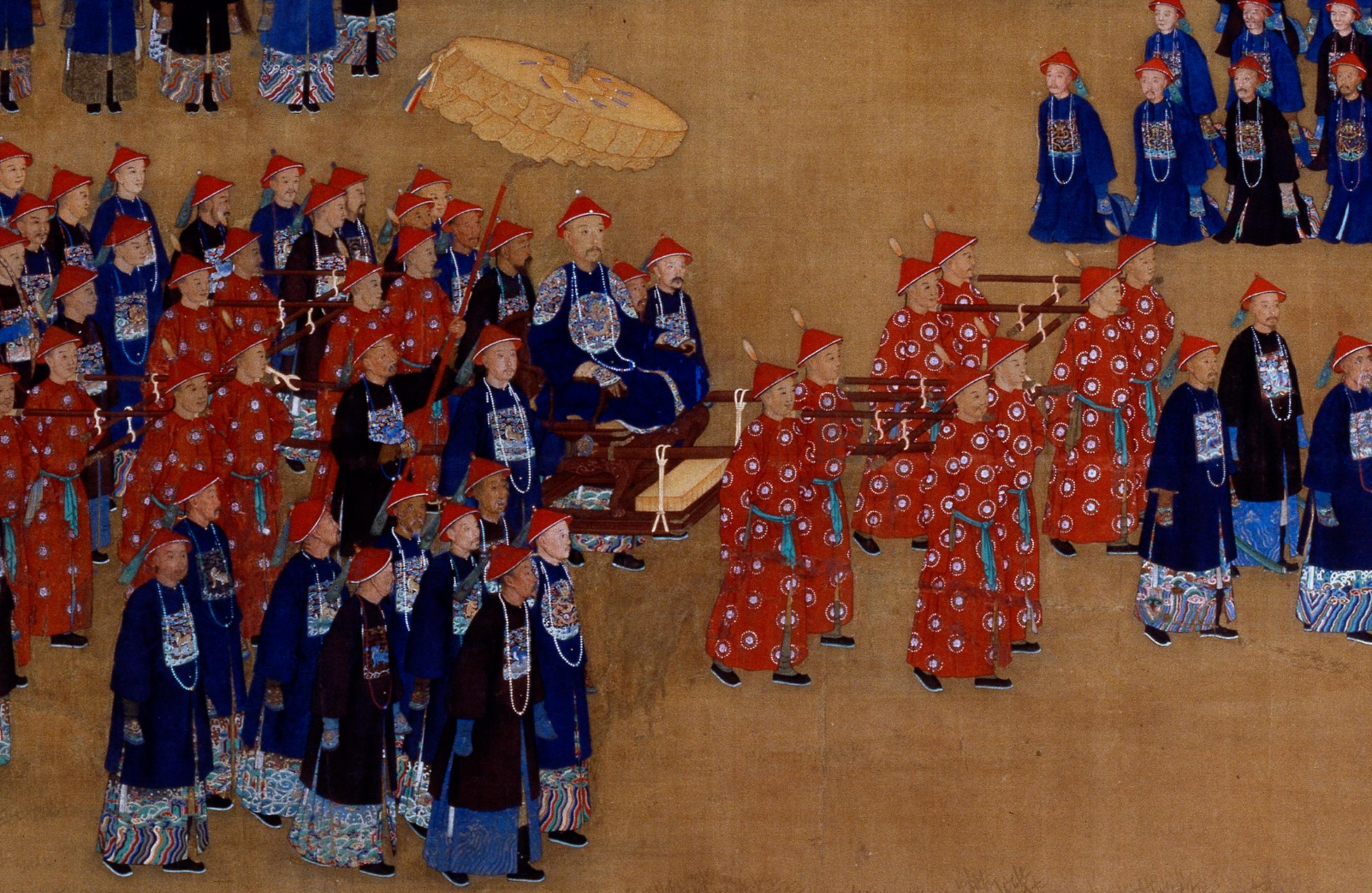 在画面的左下方,乾隆皇帝在文武官员簇拥下,缓缓进入宴会场地。3位前导武官走在队列最前方,其中一人手持云龙黄伞。有两位官员紧随其后,再后面是由二品文武官员组成的两列纵队。紧接着,前后各有8位舆士抬着紫檀雕花步辇,乾隆帝趺坐其上,头戴夏冠,身穿明黄色龙袍,外罩石青色四团龙衮服。舆士身穿小团花红色长袍,以绿带束腰。乾隆皇帝的两侧和后面有手执曲柄华盖、弓矢的扈从、官员、侍卫30余人。园内众人纷纷下跪迎接。宴桌东西两边相对而跪的是亲王至文二品大员,各两排,共54人。西边面向皇帝跪拜的人群中,前三排是亲王、郡王、贝勒、贝子以及文武一二品官员共49人,后五排是入觐的少数民族部落首领及随从共70人。