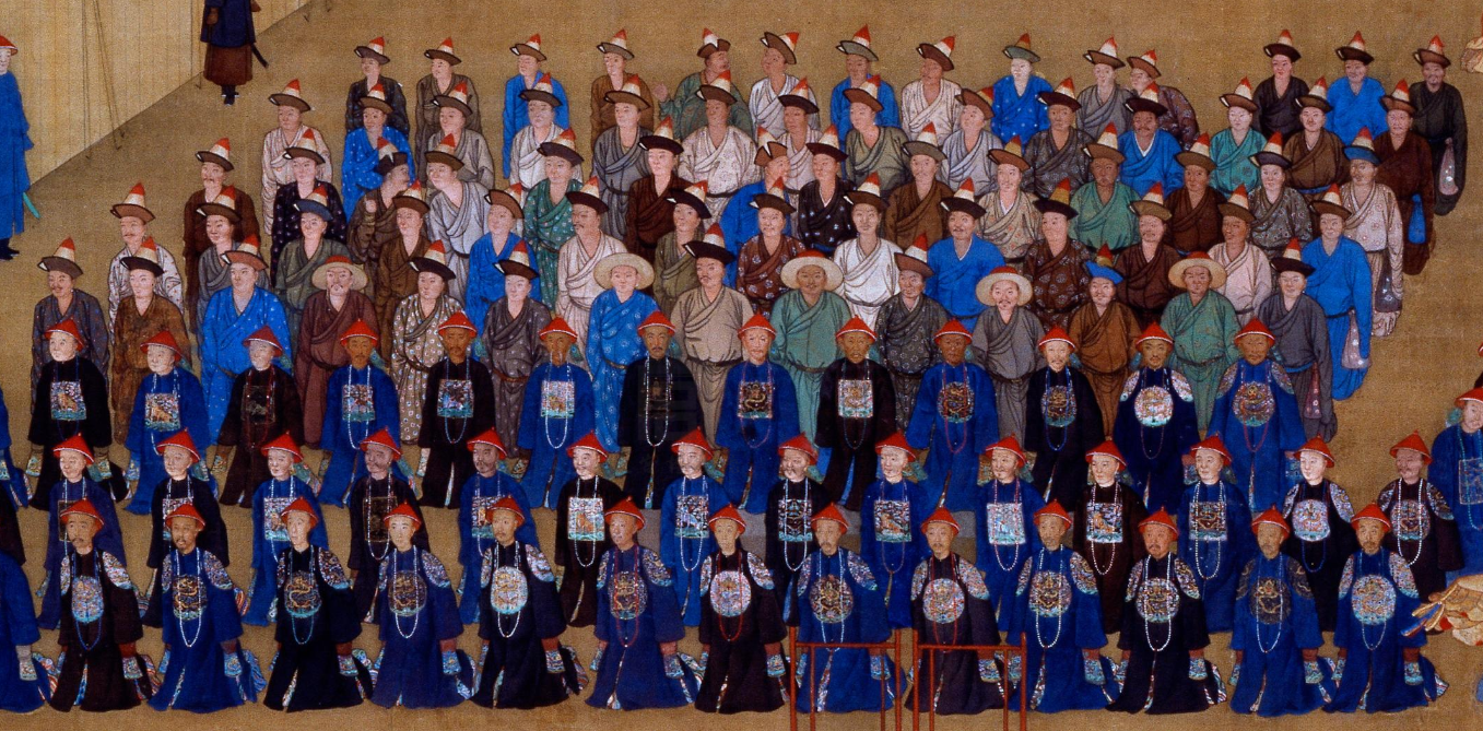 ▲《万树园赐宴图》局部,后五排入觐的少数民族部落首领及随从,共70人。来源:故宫博物院