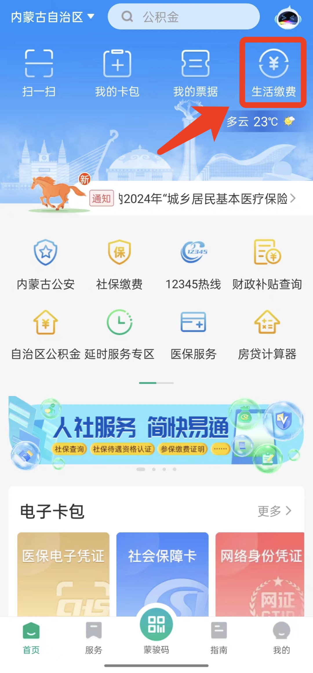 下载并登录“蒙速办”APP,在首页找到“生活缴费”。