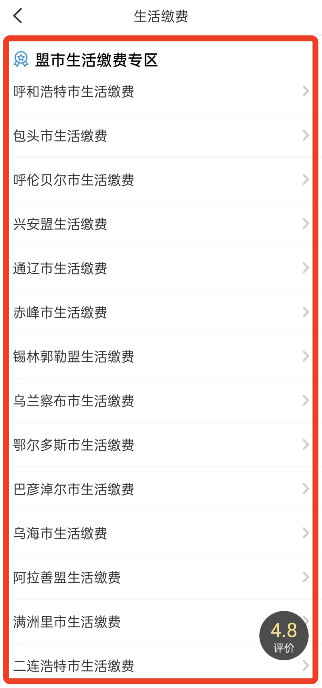 进入“生活缴费”页面后,选择所在盟市“生活缴费”点击进入。
