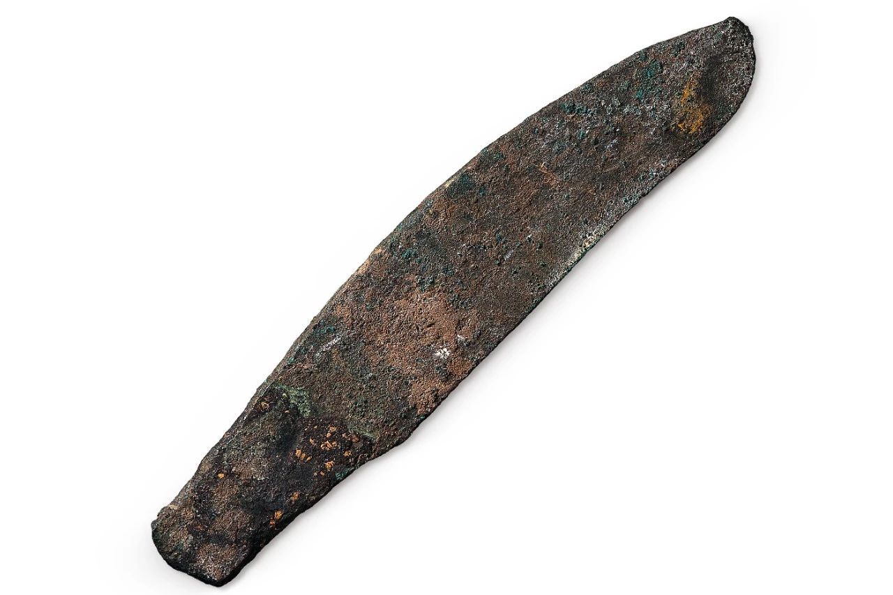 ▲1975年甘肃省临夏回族自治州东乡族自治县林家遗址出土的青铜刀,这也是迄今为止我国发现的年代最早的一件青铜器。图片来源:中国国家博物馆官网