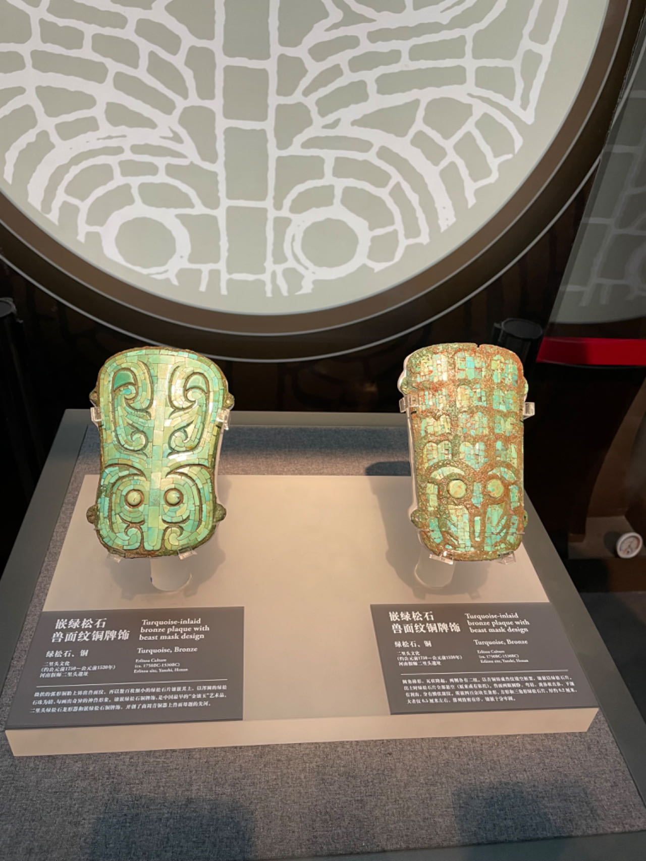 ▲二里头遗址出土的嵌绿松石兽面纹铜饰牌。文静摄