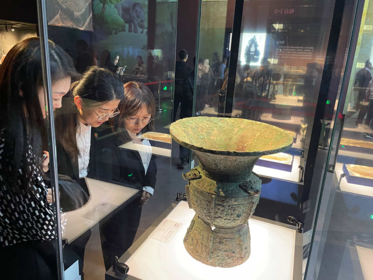 ▲在中国考古博物馆,观众观赏河南安阳殷墟妇好墓出土的铜尊。文静摄