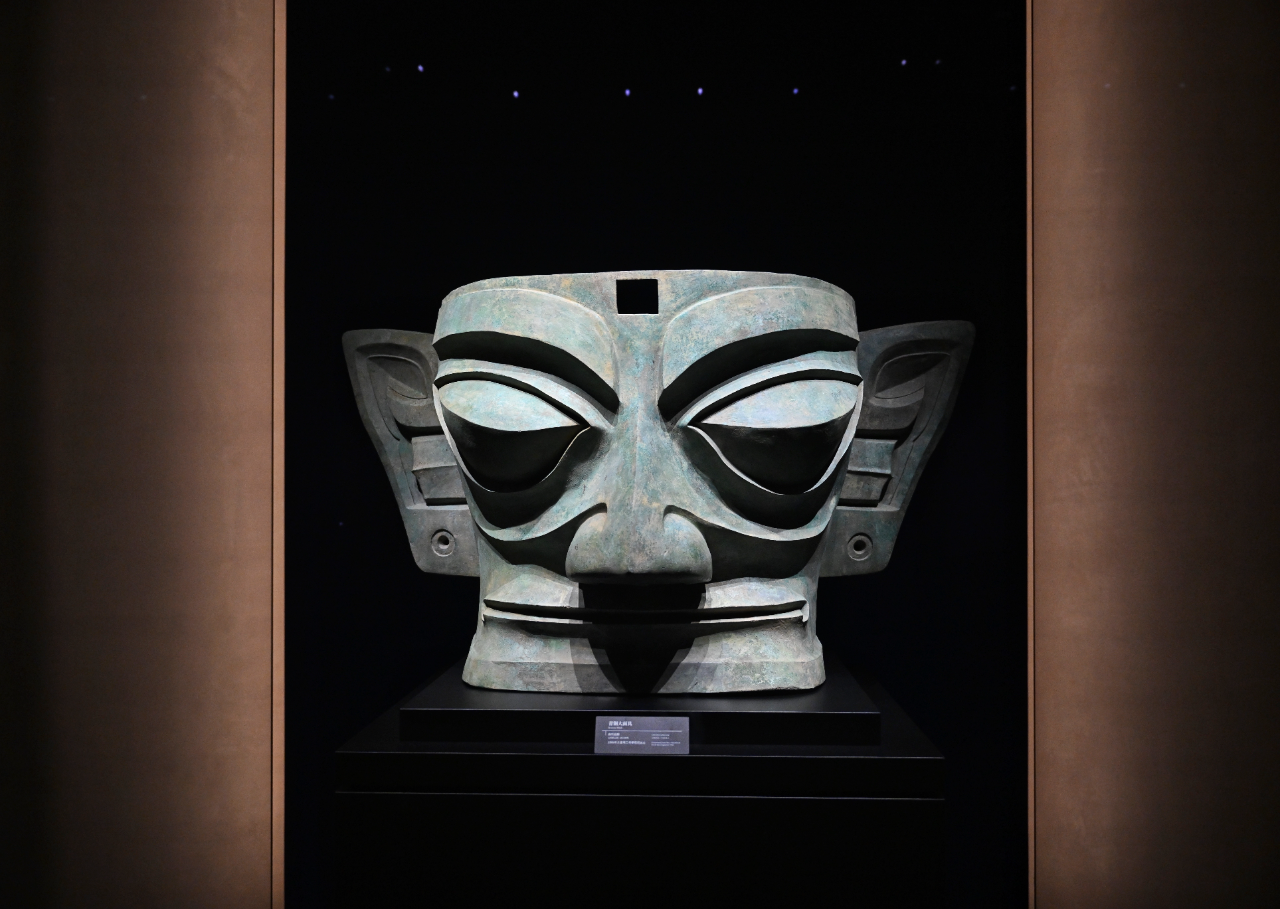 ▲三星堆博物馆新馆展出的大型青铜面具。新华社记者 刘坤摄