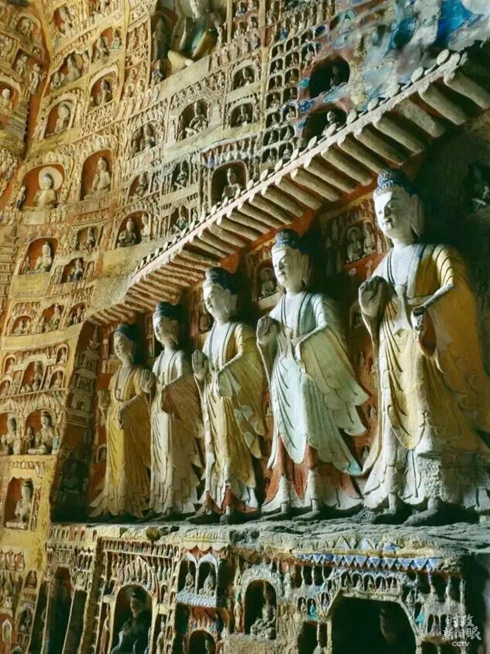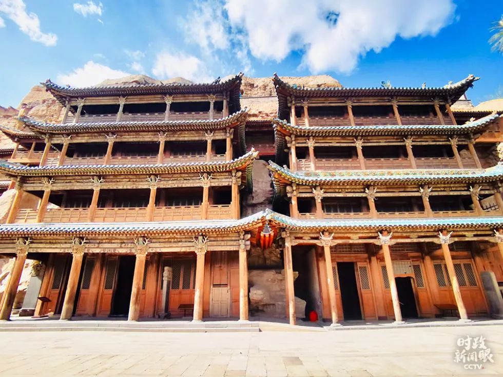 ▲第5、6窟是工程浩大、雕饰华丽的典型洞窟。窟前四层木质楼阁为清顺治八年(1651年)所建。(总台央视记者李辉、杨波拍摄)