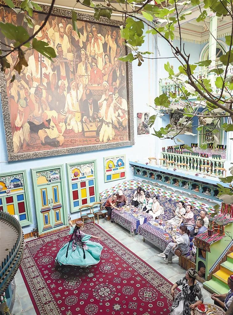 ▲在新疆喀什古城景区“古丽的家”旅游家访点,演员在随音乐起舞。新华社记者 兰红光摄