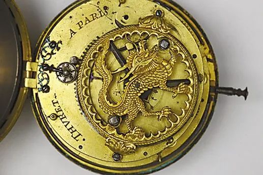 ▲铜镀金壳开光人物像怀表摆轮保护罩上镂雕着五爪金龙。 故宫博物院供图