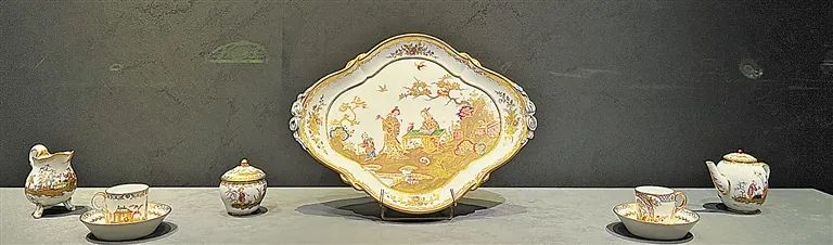 中国文化深刻影响着法国的艺术风尚。17世纪下半叶,法国开始关注和研究中国制瓷工艺。18世纪中叶,高岭土矿的发现使法国在塞弗尔瓷器工场成功生产出硬瓷。这些瓷器的造型和装饰图案多受到中国文化的影响。展览中一套彩绘描金风景人物图成套瓷茶具,是塞弗尔瓷器工场著名画家雷科的作品,瓷器主题图案为中国风景人物,描绘了西方人想象中的中国人闲适安逸的田园生活。