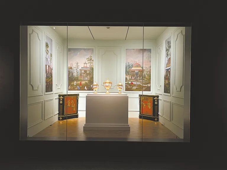 法国在油画、版画、挂毯、纺织品、漆器、建筑、园林等诸多领域也大量汲取中国元素,这在凡尔赛宫及其附属宫苑的装饰和陈设中就有突出体现。路易十五的王后玛丽·莱什琴斯卡曾以中国风格为主题,两次重新布置她在凡尔赛宫的房间。一次是1747年贴满中国风格的壁纸,称“中国厅”;另一次是1761年布置了8幅描绘中国人茶叶种植和贸易活动的巨幅油画,并将“中国厅”改为“中国人厅”。本次展览特别在文华殿工字廊北端,复刻了玛丽·莱什琴斯卡王后“中国人厅”的场景,观众可一窥凡尔赛宫的中国时尚。