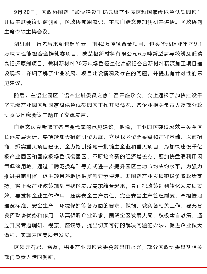 区政协围绕“加快建设千亿元级产业园区和国家级绿色低碳园区”开展主席会议协商调研