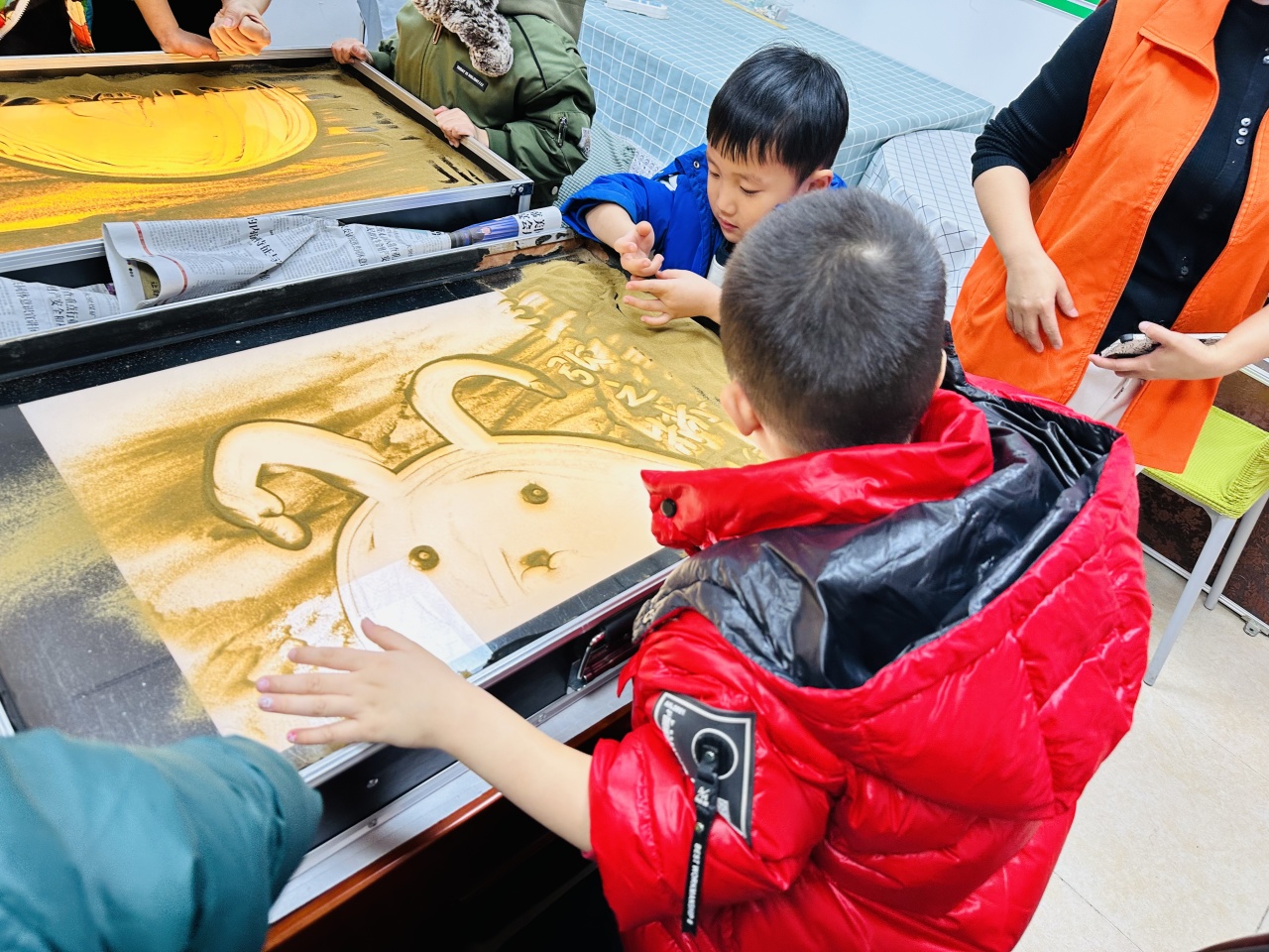 活动开始后,社区工作人员李帅以手为笔、以沙为墨,现场展示了沙画的绘制过程,一缕缕细沙在她的“指挥”下不断在玻璃背板上变换各种形态,时而划,时而抹,时而抓,时而撒,时而点……她一边为孩子们示范,一边用生动活泼地语言讲解沙画绘制过程中使用的基本手法和需要注意的事项。孩子们热情高涨,他们被变幻莫测的指尖艺术所吸引,在老师简单讲解了沙画的创作方法之后,不仅踊跃回答问题,也大胆提出问题,个个跃跃欲试,纷纷争做“小小沙画师”。经过老师的指导和大家的互相帮助,一幅幅生动可爱的图画在孩子们指间跃然而生。