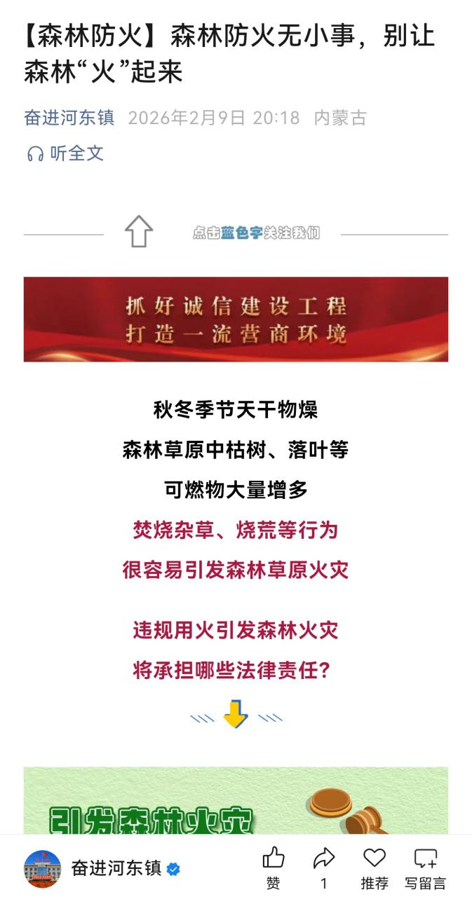 为提升全民防灭火意识,河东镇应急管理办加大“线上+线下、传统+现代”立体宣传力度,构建多维度、全覆盖的宣传格局。线上,通过微信公众号、村微信群等渠道,推送森林草原防灭火知识,扩大宣传覆盖面。线下,通过悬挂宣传横幅、张贴宣传海报、村委广播等方式,普及防灭火知识和法律法规。让“森林防火,人人有责”的理念深植于心、落实于行,引导广大群众自觉履行防灭火义务,主动参与隐患排查和宣传引导,形成群防群治、全民参与的良好社会氛围。