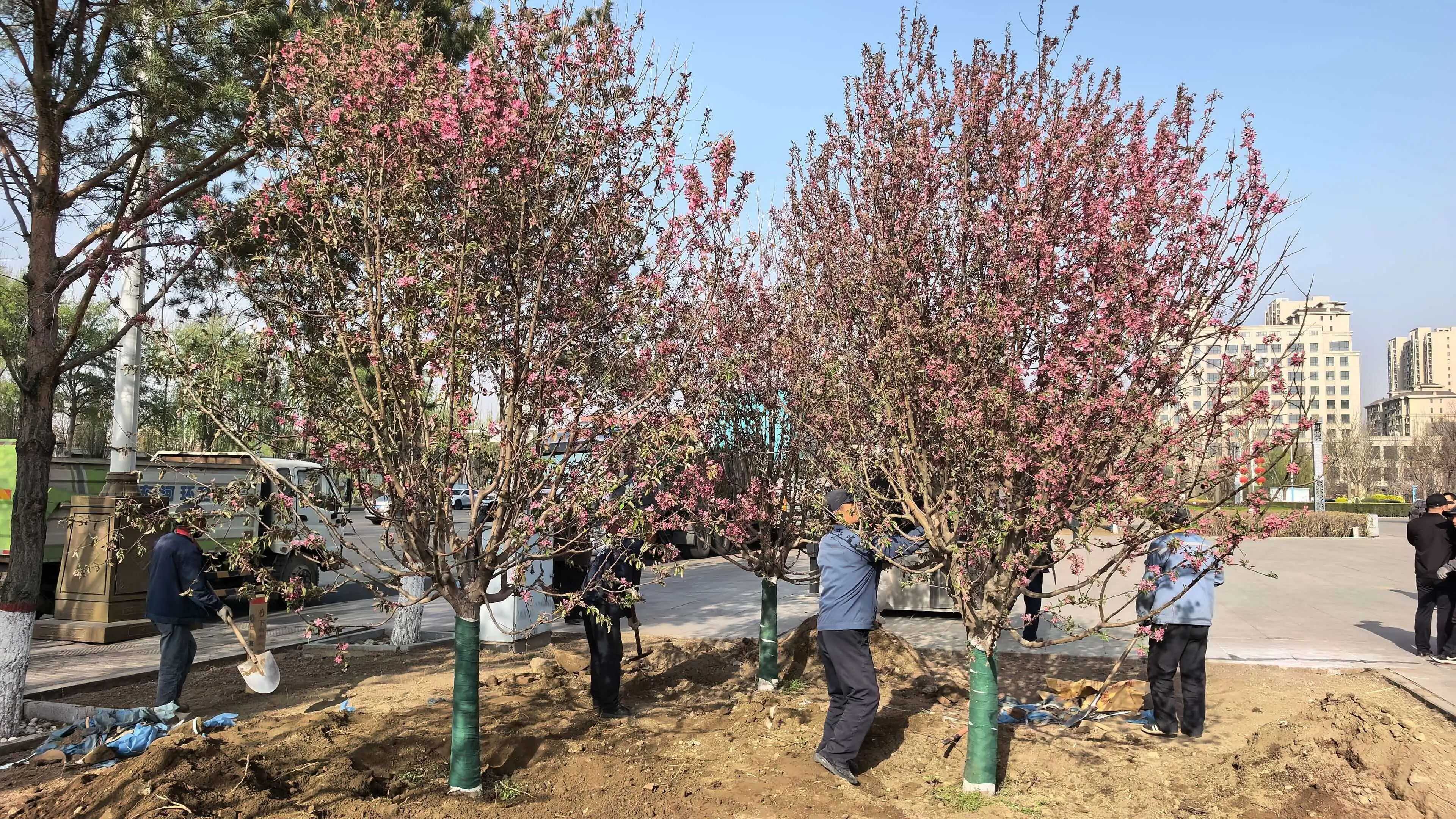 如何让每一棵树不仅“落得下”,更能“活得好”?标准化作业与精细化管理是关键。从“随挖、随运、随栽、随浇、固定支撑”的抢时作业,到优选国槐、山桃、丝棉木、金叶榆等本地适生苗木,再到严把栽植与养护的每道关口,确保了绿化补植的成活率。